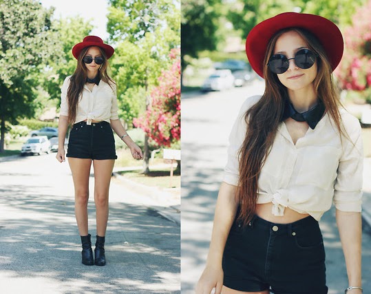 Bem descontraído, perfeito para as férias e para o inverno também, aqui em Goiânia pelo menos, inverno é sinônimo de calor e seca, logo, esse look se encaixa perfeitamente.Gostei do detalhe da amarração da blusa, fazendo referência a crop top ( clique aqui e veja matéria sobre ). O colar faz referência a uma gola, adorei os óculos, e o chapéu vermelho é um mimo só. Quem quiser se inspirar no look, um all star no lugar da bota também vai ficar show 😉
